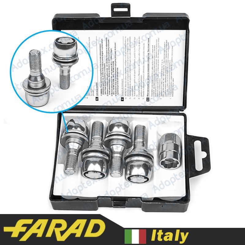 Оригинальные секретки Farad изготовляются на заводе в Италии. В данном комплекте представлено 4 болта с индивидуальным секретным рисунком и ключом к ним. Внутри упаковки содержится специальный код для возможности восстановления ключа при его потере.