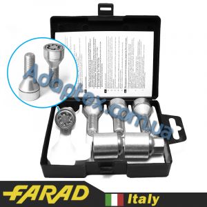 Оригинальные секретки Farad изготовляются на заводе в Италии. В данном комплекте представлено 4 болта с индивидуальным секретным рисунком и ключом к ним. Внутри упаковки содержится специальный код для возможности восстановления ключа при его потере.