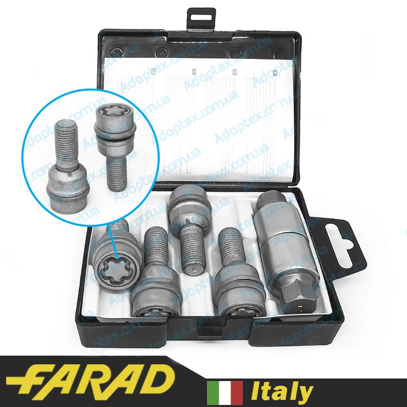 Оригінальні секретки Farad виготовляються на заводі в Італії. У даному комплекті представлено 4 болти з індивідуальним секретним малюнком та ключем до них. Усередині упаковки міститься спеціальний код для відновлення ключа при його втраті.