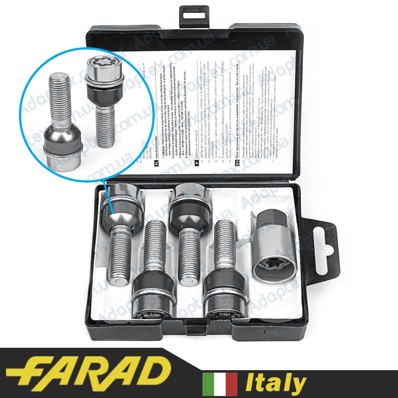 Оригинальные секретки Farad изготовляются на заводе в Италии. В данном комплекте представлено 4 болта с индивидуальным секретным рисунком и ключом к ним. Внутри упаковки содержится специальный код для возможности восстановления ключа при его потере.