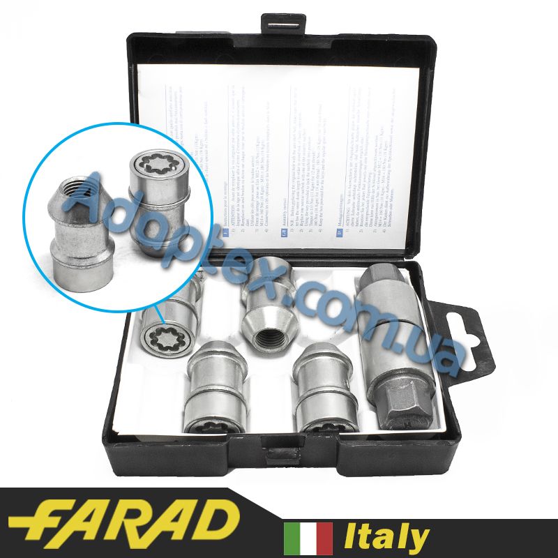 Оригинальные секретки Farad изготовляются на заводе в Италии. В данном комплекте представлено 4 гайки с индивидуальным секретным рисунком и ключом к ним. Внутри упаковки содержится специальный код для возможности восстановления ключа при его потере.