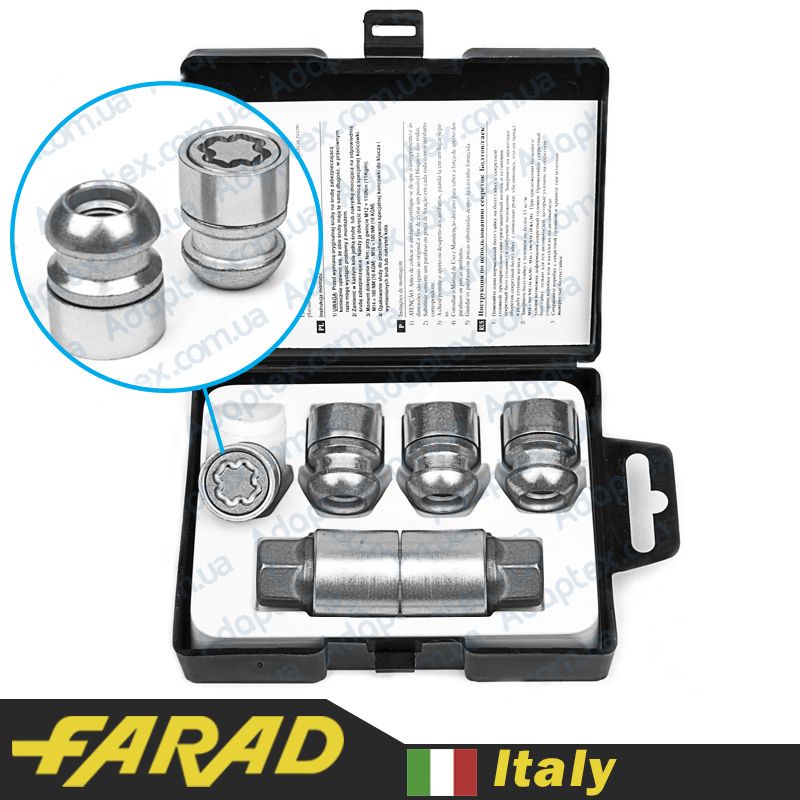 Оригинальные секретки Farad изготовляются на заводе в Италии. В данном комплекте представлено 4 гайки с индивидуальным секретным рисунком и ключом к ним. Внутри упаковки содержится специальный код для возможности восстановления ключа при его потере.