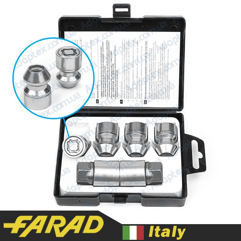 Оригинальные секретки Farad изготовляются на заводе в Италии. В данном комплекте представлено 4 гайки с индивидуальным секретным рисунком и ключом к ним. Внутри упаковки содержится специальный код для возможности восстановления ключа при его потере.