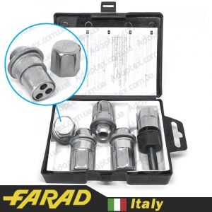 Оригинальные секретки Farad изготовляются на заводе в Италии. В данном комплекте представлено 4 болта с индивидуальным секретным рисунком и ключом к ним. Внутри упаковки содержится специальный код для возможности восстановления ключа при его потере.