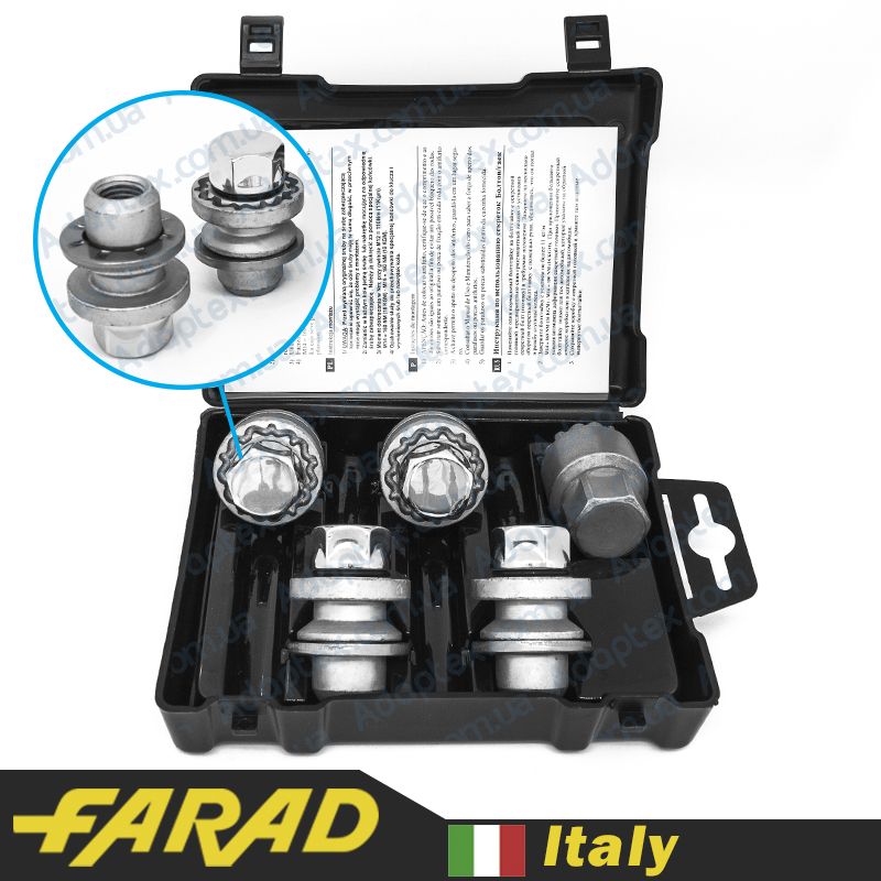 Оригинальные секретки Farad изготовляются на заводе в Италии. В данном комплекте представлено 4 болта с индивидуальным секретным рисунком и ключом к ним. Внутри упаковки содержится специальный код для возможности восстановления ключа при его потере.