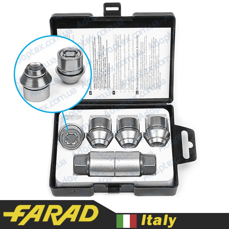 Оригинальные секретки Farad изготовляются на заводе в Италии. В данном комплекте представлено 4 гайки с индивидуальным секретным рисунком и ключом к ним. Внутри упаковки содержится специальный код для возможности восстановления ключа при его потере.