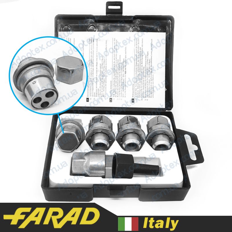 Оригинальные секретки Farad изготовляются на заводе в Италии. В данном комплекте представлено 4 болта с индивидуальным секретным рисунком и ключом к ним. Внутри упаковки содержится специальный код для возможности восстановления ключа при его потере.